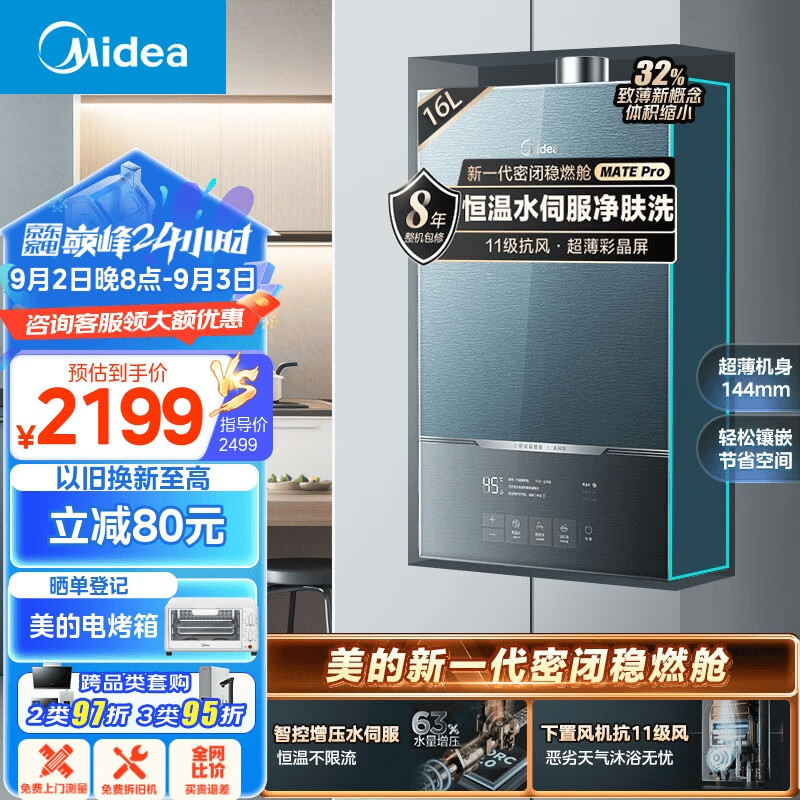 美的(Midea)【小蛮腰】超薄16升燃气热水器天然气 低噪水伺服 恒温净肤洗 新一代密闭稳燃JSQ30-MATE Pro尘隐价格:2199.00元!