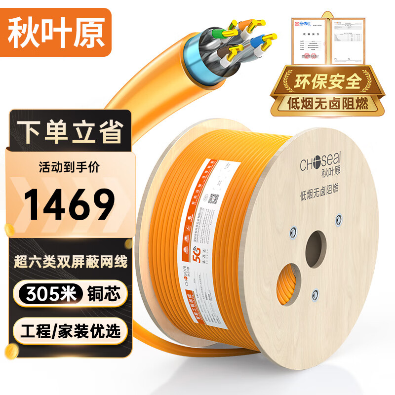 秋叶原(CHOSEAL)超六类双屏蔽低烟无卤阻燃网线 CAT6A类万兆0.57纯铜芯 工程家装环保无毒 305米橙色 QS6169CLT305价格:1371.70元!