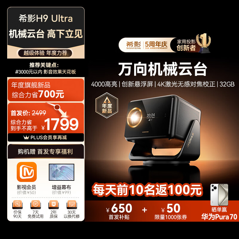 希影(Signyean)H9 Ultra 家用4K投影仪 超高清家用卧室投影机 4000亮度智能影院 激光自动校正2024新品旗舰32G价格:2499.00元!