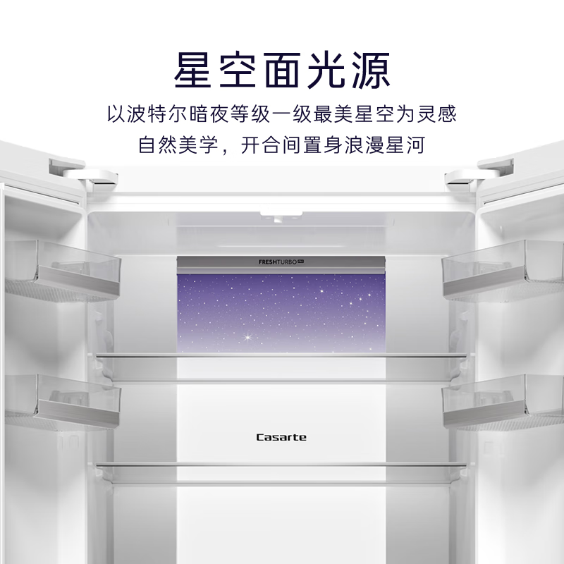 5、星空卡萨帝打开很漂亮浪漫给生活增点了许多小意境!470L的存储空间,用起来足够宽松!蔬菜保鲜空间技术让生活更方便些!