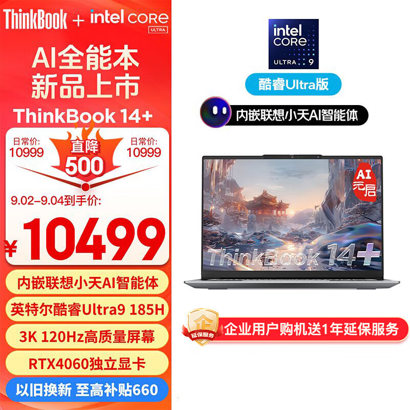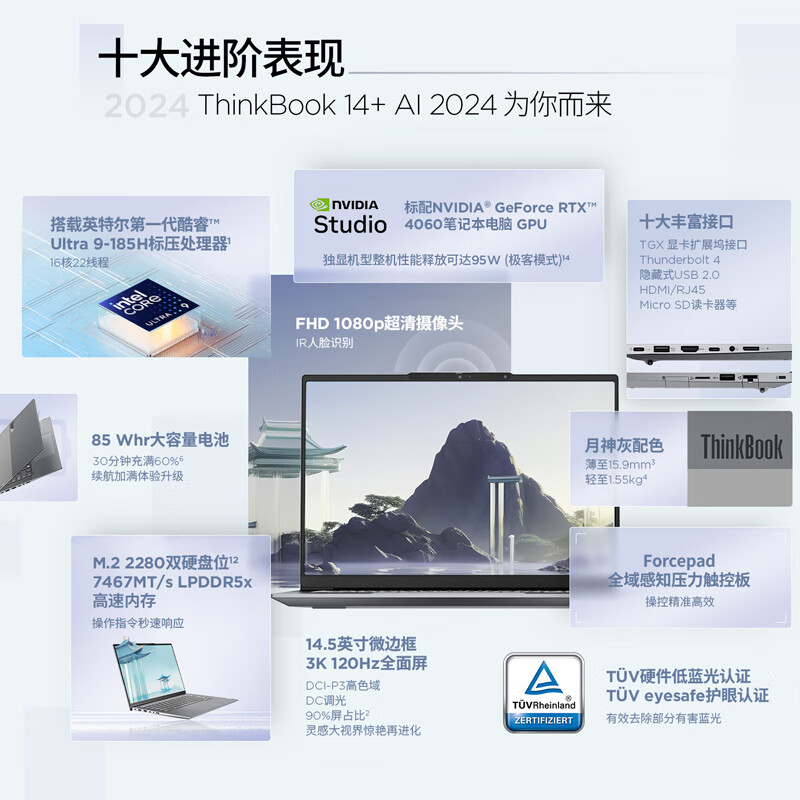 ThinkPad联想笔记本电脑ThinkBook 14+ 2024 AI全能本 英特尔酷睿Ultra9 185H 14.5英寸 32G 1T 3K RTX4060价格:10499.00元!