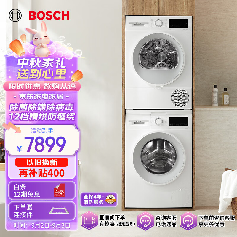 博世(BOSCH)【云朵白主推】洗烘套装10KG云朵白大容量全自动洗衣机热泵烘干机一级能效防缠绕 152000+252U0A价格:8299.00元!