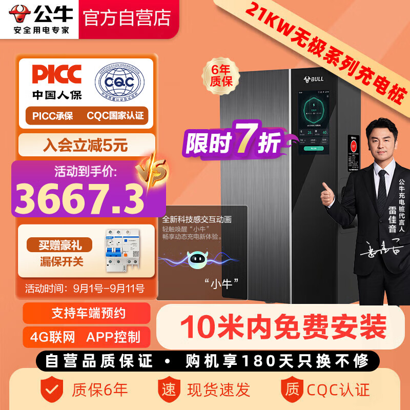 公牛新能源汽车交流充电桩适配于小米su7汽车特斯拉比亚迪问界小鹏理想蔚来 21KW无极款 4G含10米安装价格:5239.00元!