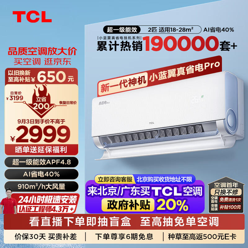 TCL空调 2匹小蓝翼真省电Pro 空调挂机 超一级能效省电40% 变频冷暖 卧室挂机KFR-46GW/RT2Ea+B1价格:2999.00元!