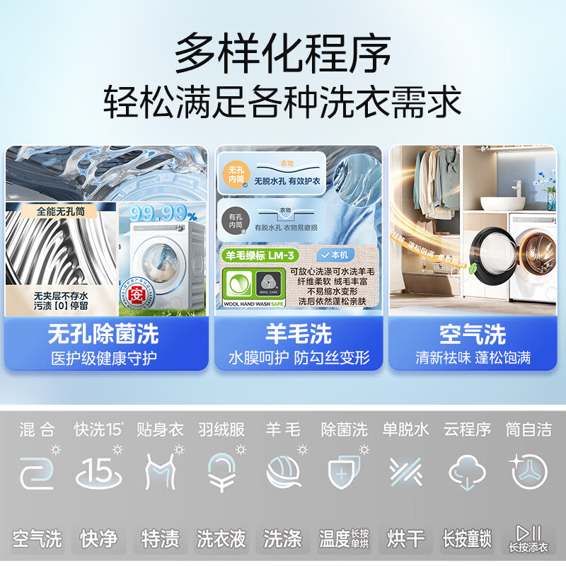 2、用了很多年的美的洗衣机终于赢来了换代,还是一如既往选择美的,这款纯白纯平全嵌洗衣机,不仅颜值高,而且内孔也采用了无孔内筒,正所谓里子面子都有啦,就果断下单了,几乎能够满足我家所有的衣物洗护烘干需求,并且还具有元气棒和智能投放功能,彻底解放双手,并给智能生活打气加油!会推荐给朋友们!