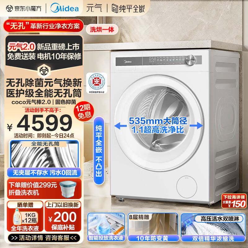 美的(Midea)滚筒洗衣机全自动家用 MD10L7PRO 10公斤洗烘一体机 纯平全嵌 元气2.0 医护级除菌螨 1.1洗净比价格:4599.00元!
