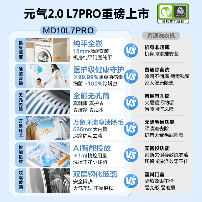 4、美的L7PRO实物真的好看,海盐白的外观颜值绝了!超级满意!1、洗衣机:智能投放功能真的太省心了,细节处理也非常到位。无孔肉筒不怕藏污纳垢,还得到了中卫安医护级认证。2、烘干机:烘干效果太牛了,烘干小件很快,烘干四件套也没什么褶皱,风量很大,烘干彻底,使用效果满意。3、洗衣烘干都是变频电机的,app上能实时监控机器运行状态,还能检测电量。特别满意的一次购物体4、纯平全嵌得外观特别平整,一点都不凸出,很美观,大筒径洗涤烘于不错