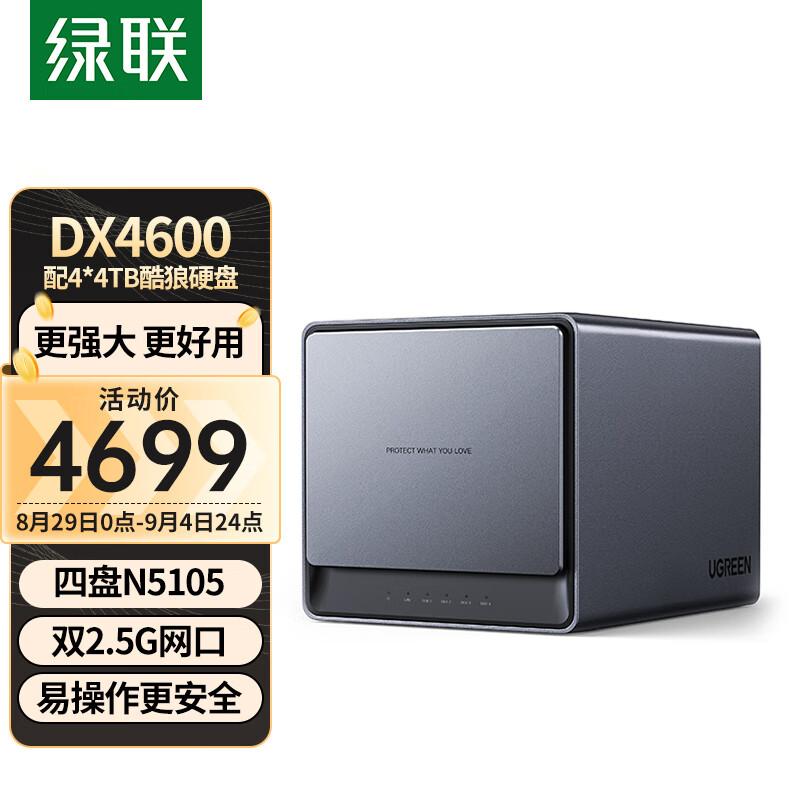 绿联(UGREEN) 私有云DX4600 16T四盘位Nas网络存储个人云硬盘服务器相册备份文件同步手机平板扩容适用iPhone15价格:5249.00元!