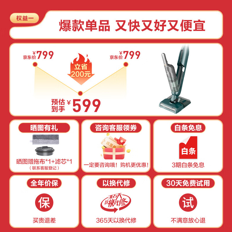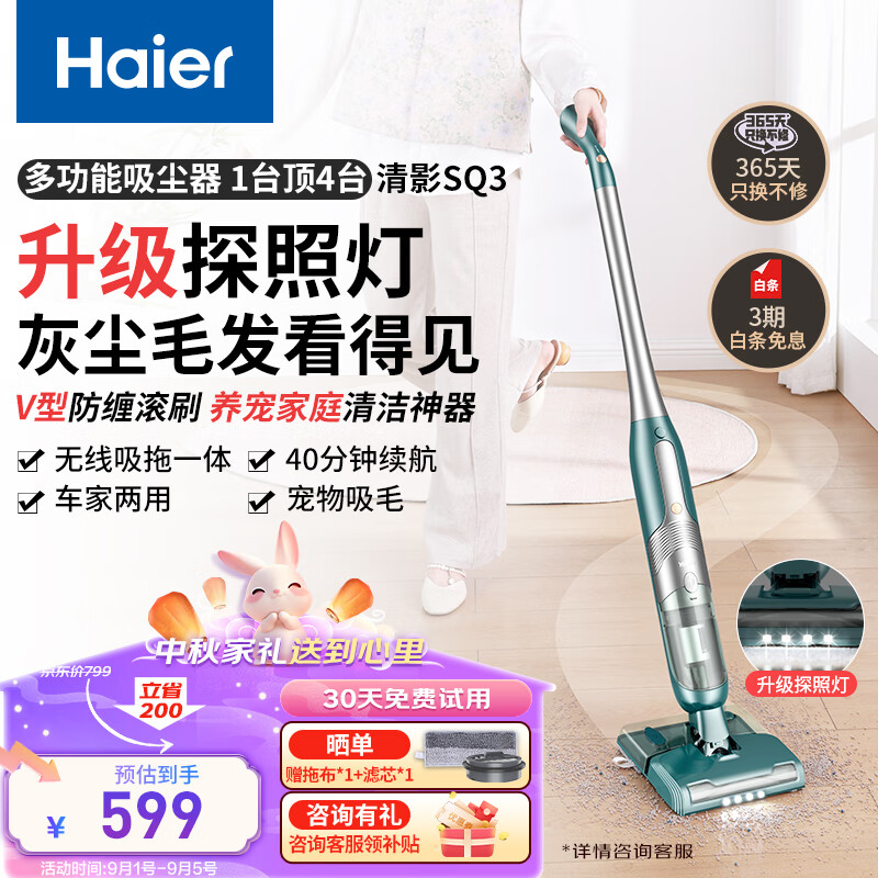 海尔(Haier)【年度新品】家用无线吸拖一体吸尘器【升级探照灯】大吸力车家两用宠物手持HZ-SQ3 V型防缠滚刷价格:599.00元!