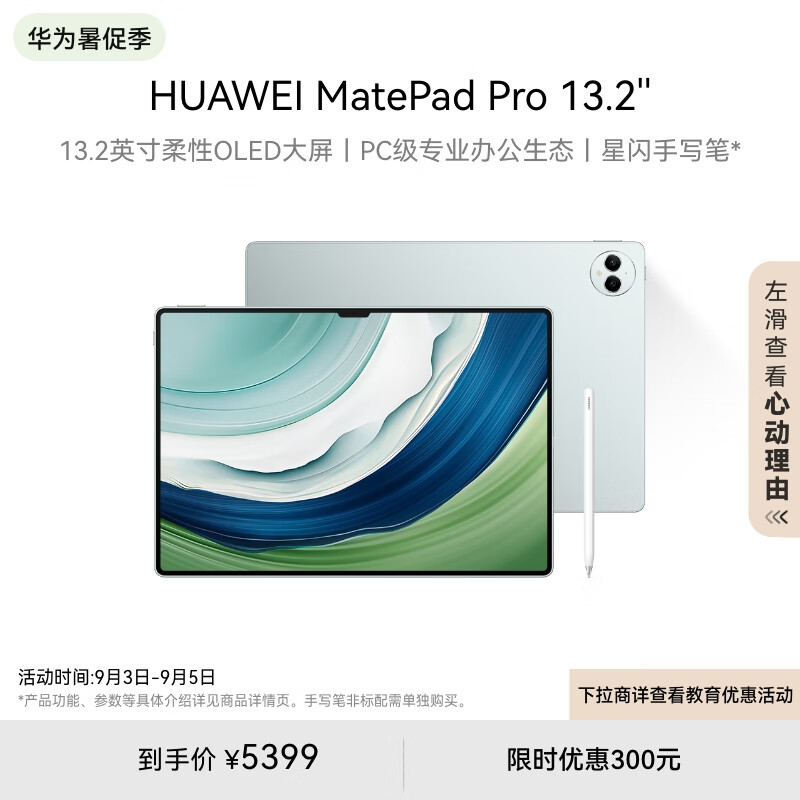 HUAWEI MatePad Pro 13.2英寸华为平板电脑2.8K 144Hz OLED护眼屏星闪连接办公创作12+512GB WiFi 雅川青价格:5399.00元!