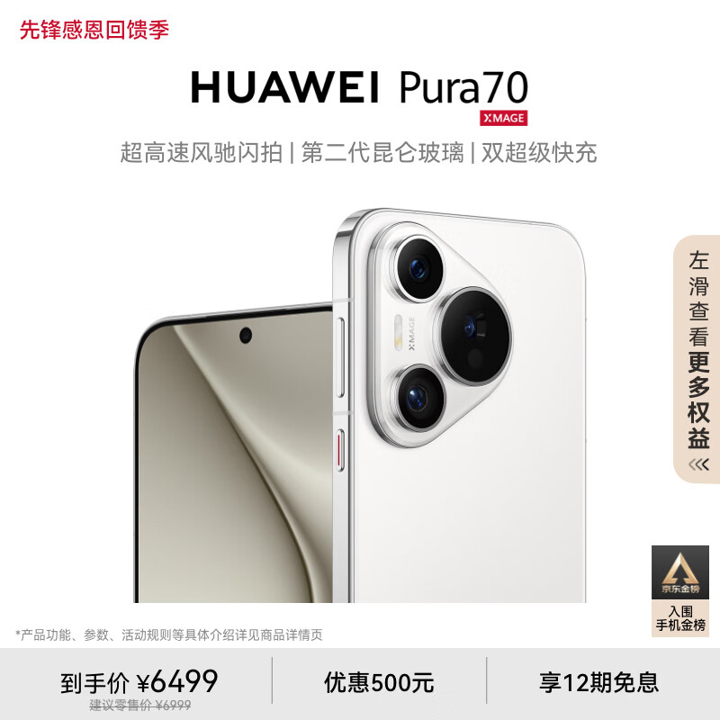HUAWEI Pura 70 雪域白 12GB+1TB 超高速风驰闪拍 第二代昆仑玻璃 双超级快充 华为P70智能手机价格:6499.00元!