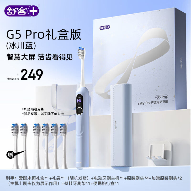 舒客1级清洁情侣电动牙刷智能换区成人/学生送男友/女友软毛护龈 情人节礼物 G5 pro冰川蓝(礼盒款)价格:299.00元!