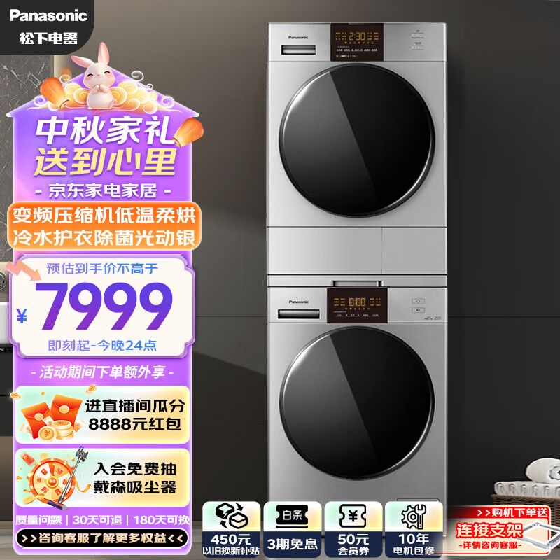 松下(Panasonic)洗烘套装 10kg滚筒洗衣机+热泵烘干机 变频压缩机 光动银除菌 1.1洗净比 3E1AC+EH10B3价格:13499.00元!
