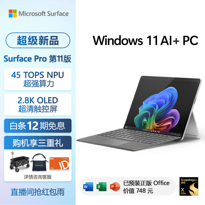 微软(Microsoft)Surface Pro第11版 骁龙X Elite 16G 1T亮铂金键盘盖触控笔套装二合一平板笔记本电脑 AIPC Pro11价格:15776.00元!