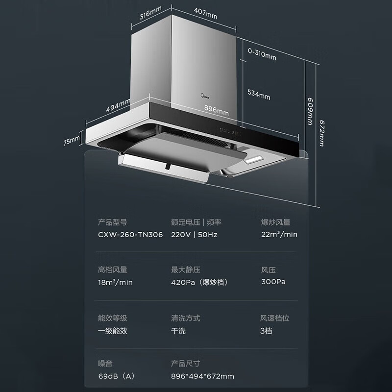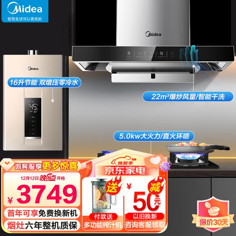 美的(Midea)抽油烟机家用欧式顶吸22立方大吸力油烟机燃气灶具热水器厨房三件套天然气厨房电器TN306+330+NT1S价格:3749.00元!