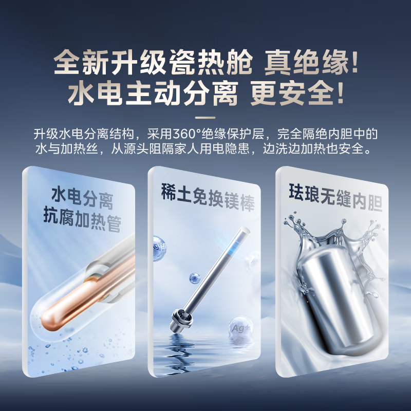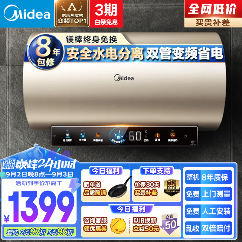 美的(Midea)终身免换镁棒80升电热水器3300W/2300W速热变频省电一级能效节能水电分离大水量F8033-JE6(HE)价格:1599.00元!