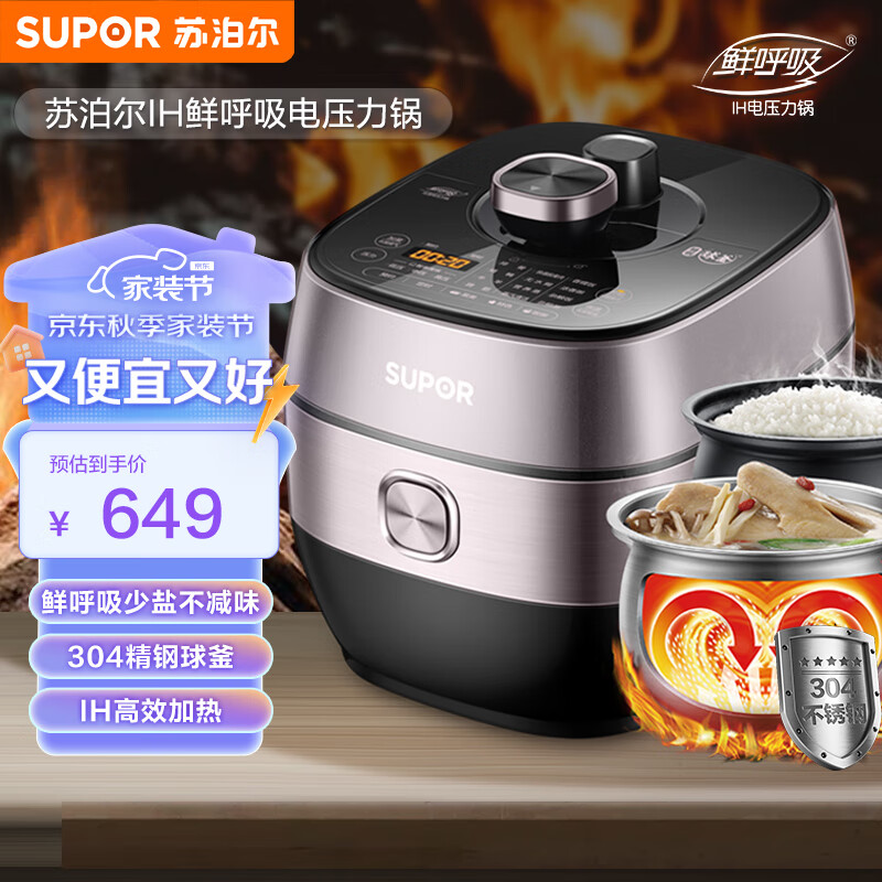 苏泊尔(SUPOR)鲜呼吸IH电锅5L家用智能预约全自动排气顶触控不锈钢球釜SY-50HC8033Q双胆电饭煲高压锅3-6人价格:649.00元!