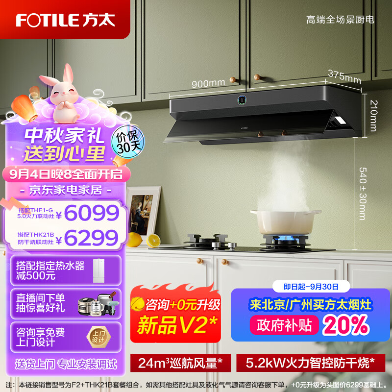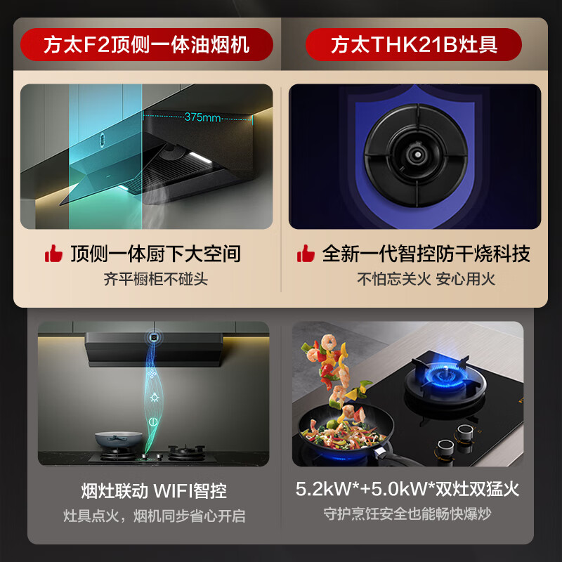方太(FOTILE)F2抽吸油烟机灶具套装 顶侧一体欧式侧吸 联动24巡航风量防干烧烟灶套餐01-F2.i+01-THK21B价格:6299.00元!