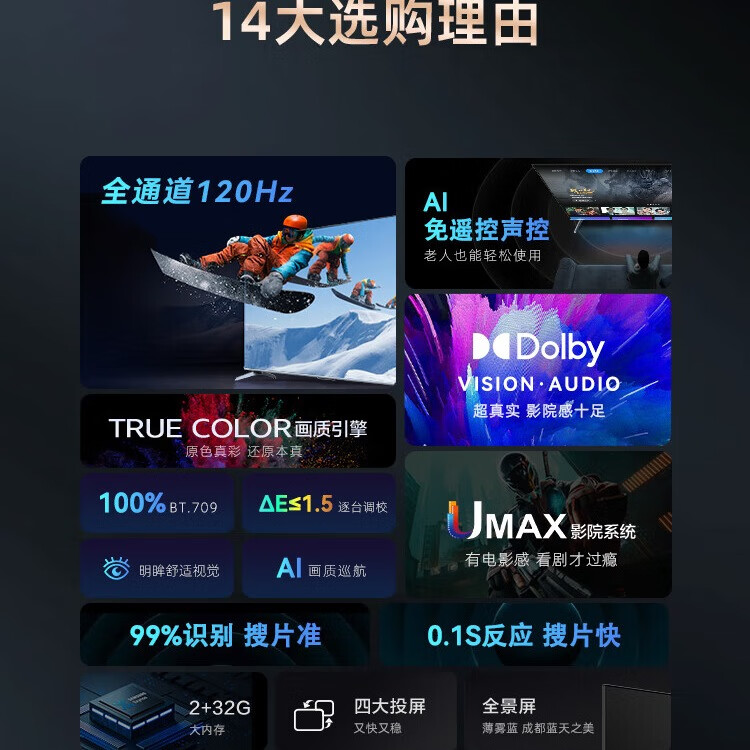 1、外形外观:外观超赞大气,很好看。运行速度:运行速度快很流畅。屏幕音效:大屏幕清晰度高,看电视给力。尺寸大小:大尺寸电视,很好用,非常满意的一款电视,性价比超高。