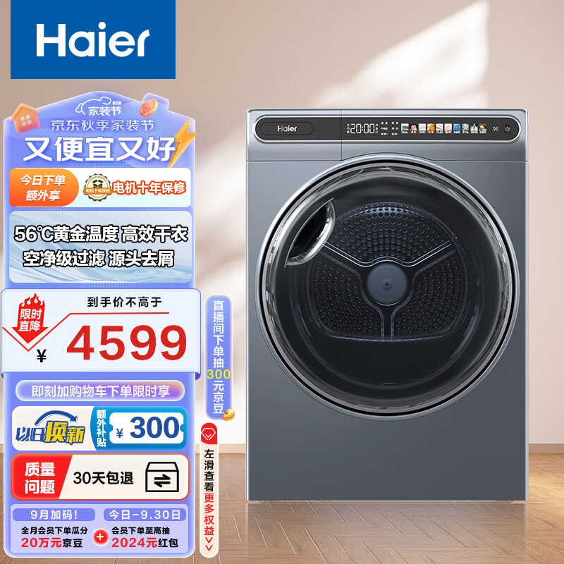 海尔(Haier)晶彩烘干机家用 10公斤热泵干衣机 空净过滤 羊毛柔烘 除菌净螨 专业护衣 EHG100MATE59 以旧换新价格:4599.00元!