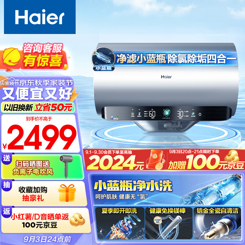 海尔(Haier)60升【3D速热小蓝瓶】净水洗瓷净瞬热美肤电热水器 家用储水式3300W速热大水量 EC6005-JE7KU1价格:2699.00元!