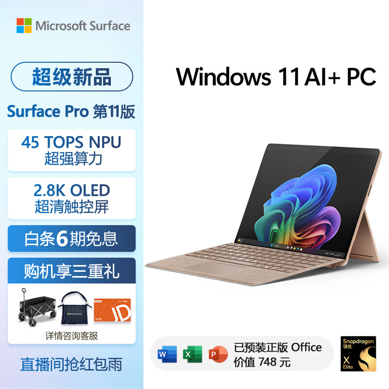 微软(Microsoft)Surface Pro第11版 骁龙X Elite 16G 512G沙漫金键盘盖触控笔套装二合一平板笔记本电脑AIPC Pro11价格:13576.00元!