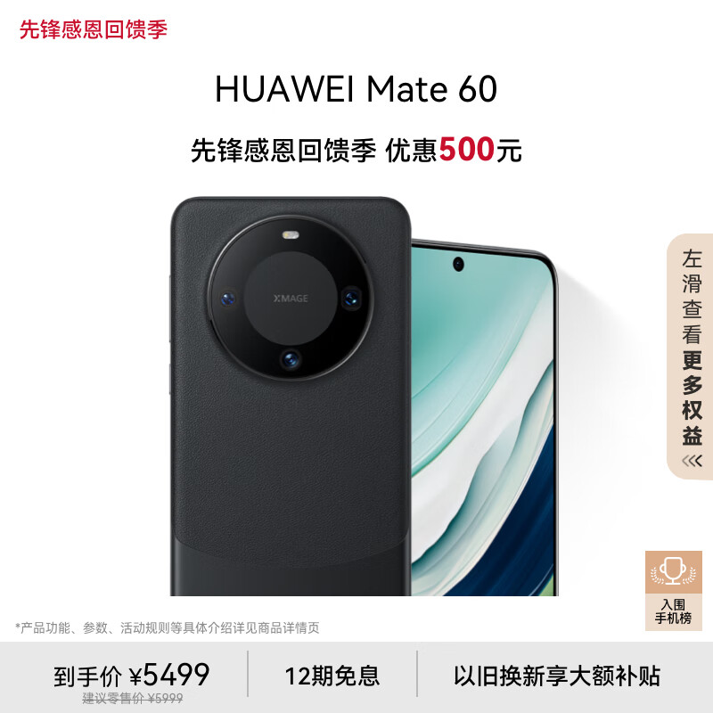 华为(HUAWEI)旗舰手机 Mate 60 12GB+512GB 雅丹黑价格:5499.00元!