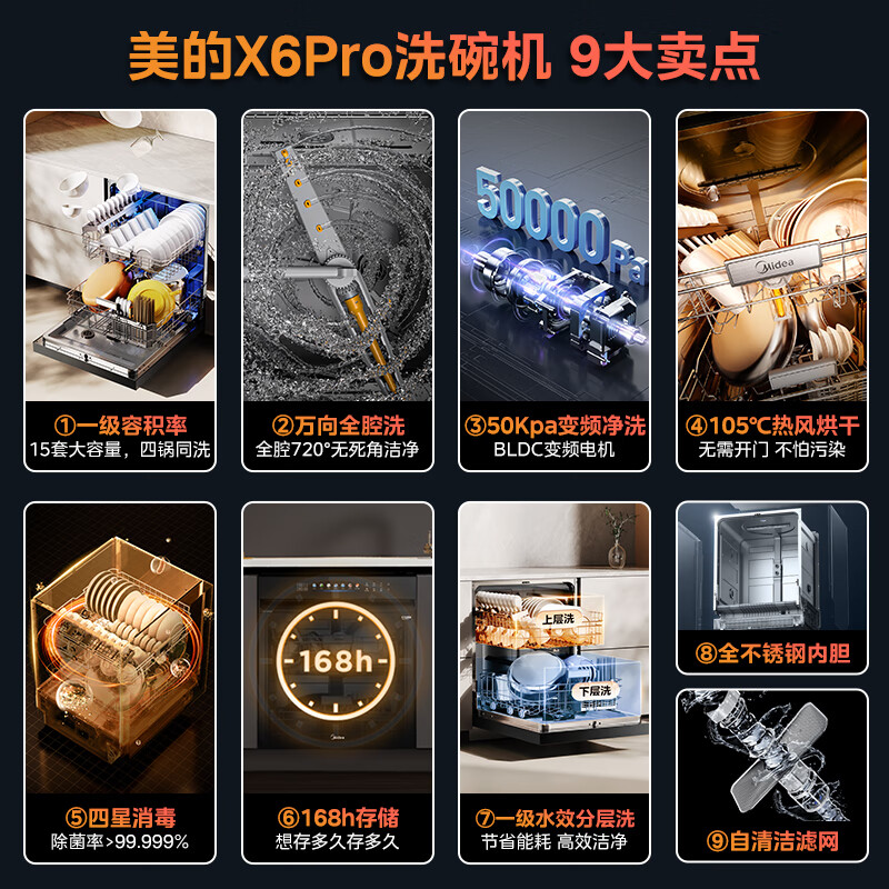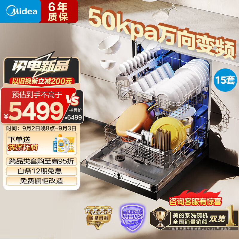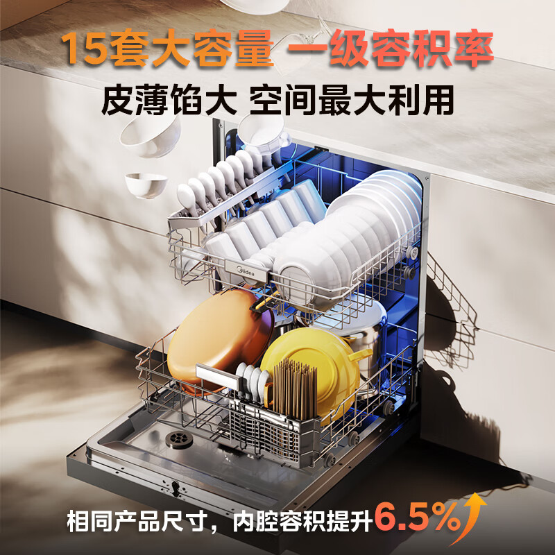 美的(Midea)嵌入式洗碗机万向X6Pro 15套一级容积率105℃热风烘干四星消毒7天存储变频自清洁滤网洗消一体机价格:5499.00元!