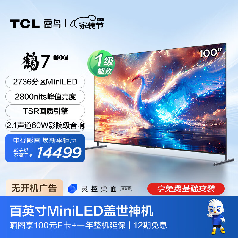 TCL雷鸟 鹤7 25款 100英寸2736分区MiniLED 峰值亮度2800nits 4+128G大内存 智能电视机100R685C Max价格:14499.00元!
