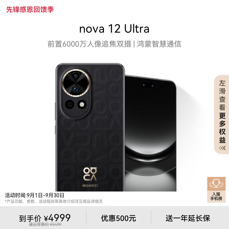 华为nova 12 Ultra 前置6000万人像追焦双摄 1TB 曜金黑 物理可变光圈 鸿蒙智慧通信华为智能手机价格:4999.00元!