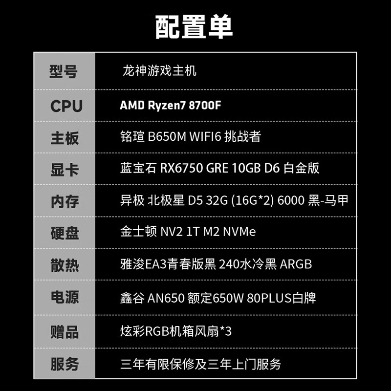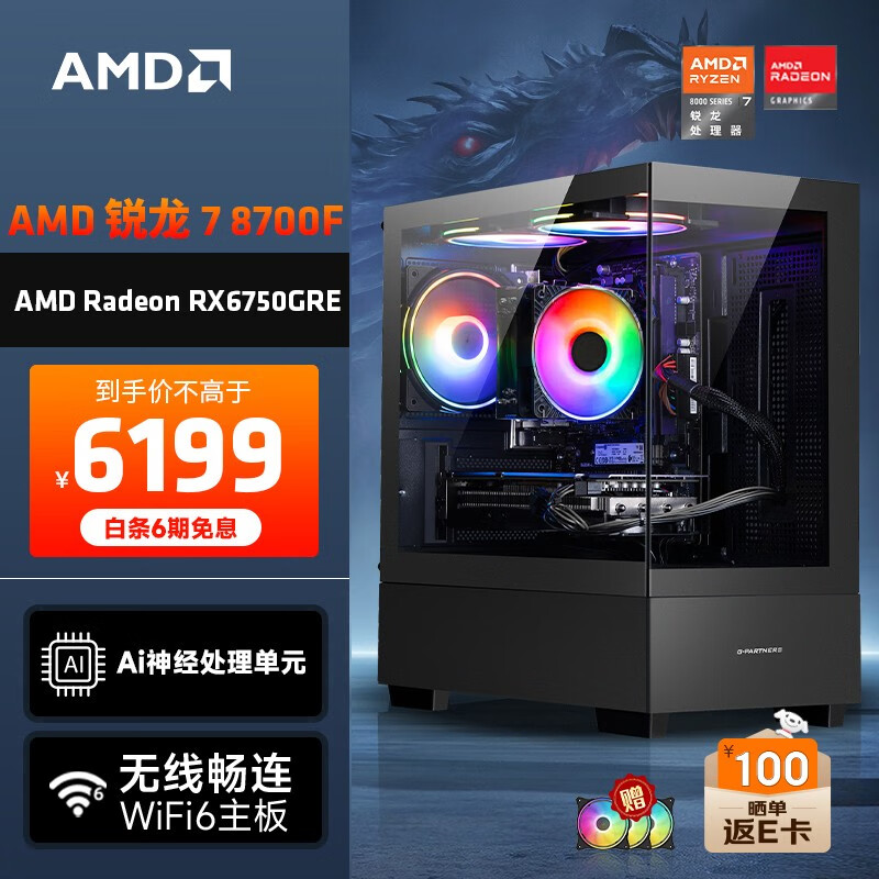 AMD龙神 锐龙R7-8700F/RX6750GRE 10G/32G/1T SSD 水冷电竞游戏设计师台式电脑主机diy组装整机价格:6799.00元!