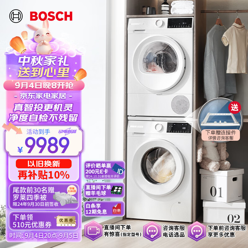 博世(BOSCH)【云朵白Plus真智投】洗烘套装10KG大容量全自动洗衣机热泵烘干机 智能投放WGE252A0AW+WQA2520A2W价格:10499.00元!