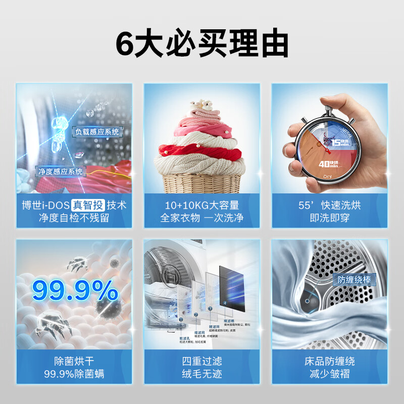 5、外形外观:简洁大方,德系精工,尤其滚筒看着很精美洗净效果:还不错,看中Woolmark羊毛手洗绿标认证除菌效果:还没用过容量大小:10kg,三口之家够用了以旧换新:家里老的波轮洗衣机抵扣了100多吧