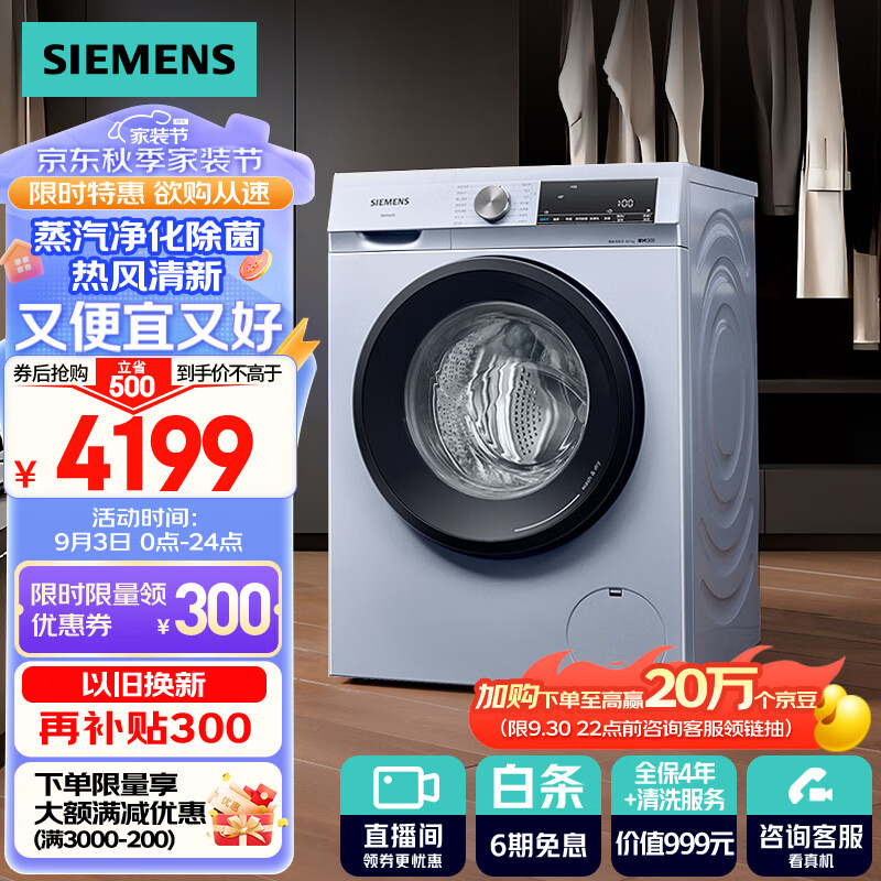 西门子(SIEMENS)10公斤滚筒洗衣机全自动带烘干 洗烘一体 蒸汽净化除菌 热风清新 双重净筒 智能烘干 X42W价格:4699.00元!