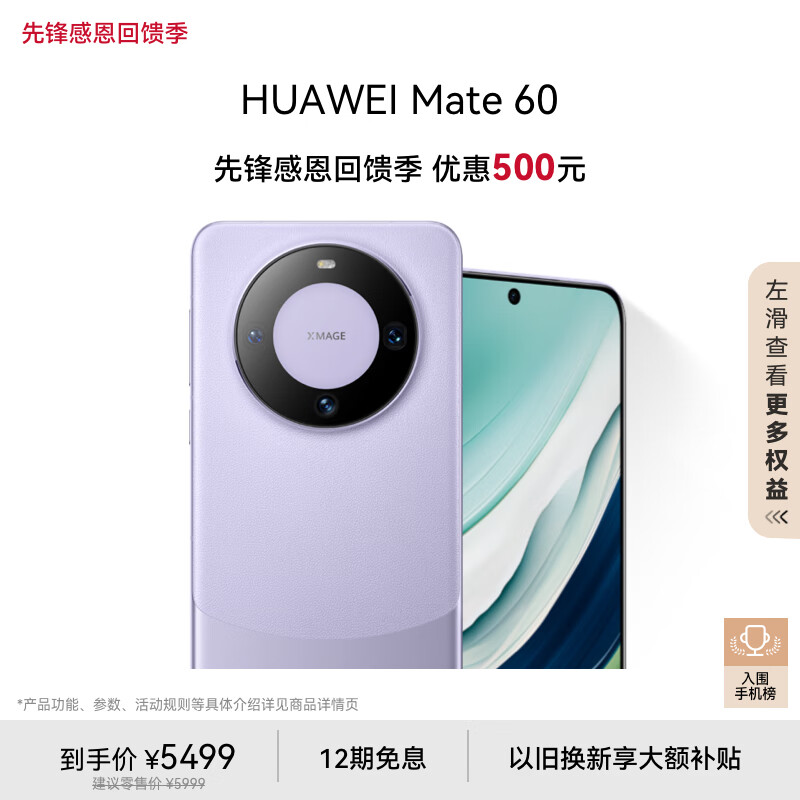 华为(HUAWEI)旗舰手机Mate 60 12GB+512GB 南糯紫价格:5499.00元!