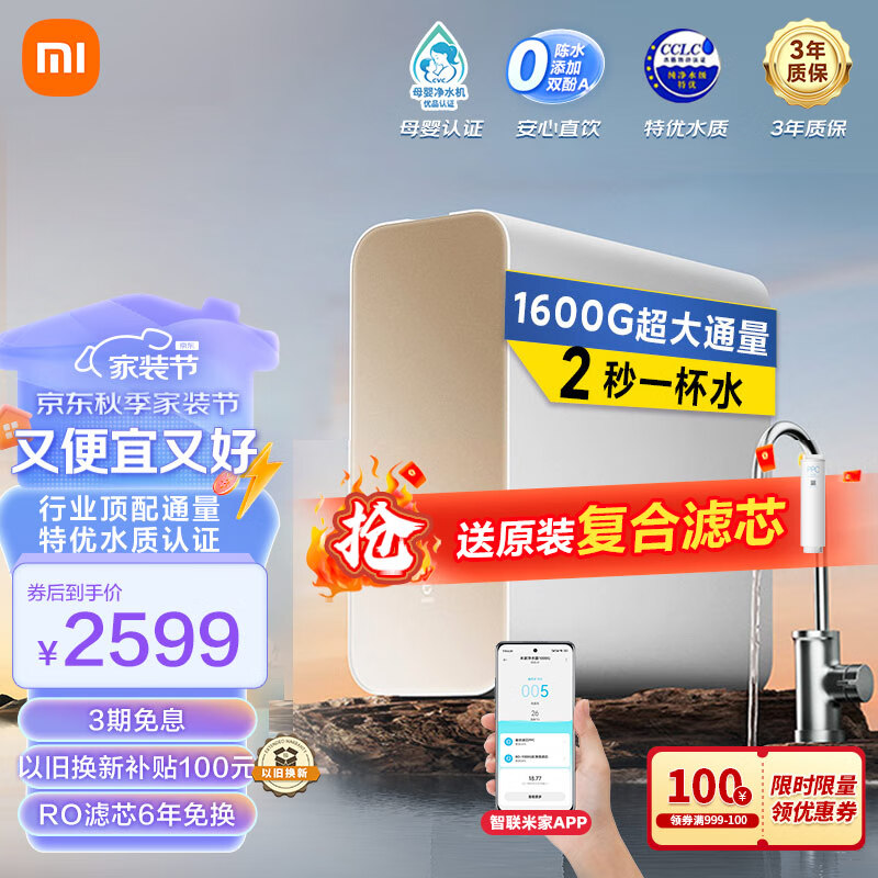 米家小米净水器1600G厨下净水器家用直饮净水机2秒一杯水 首杯可饮母婴直饮长效RO滤芯6年免更换价格:2699.00元!