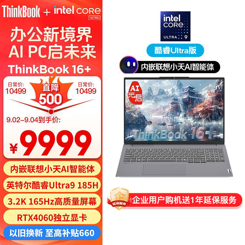 ThinkPad联想笔记本电脑ThinkBook 16+ 2024 AI全能本 英特尔酷睿Ultra9 185H 16英寸 32G 1T 3.2K RTX4060价格:9999.00元!