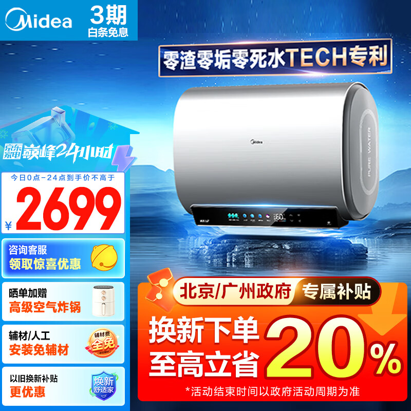 美的(Midea)TECH活水玲珑超薄60升 双胆扁桶电热水器防腐阻垢3300W镁棒免换净肤浴VIP保温F6033-UW5以旧换新价格:2899.00元!