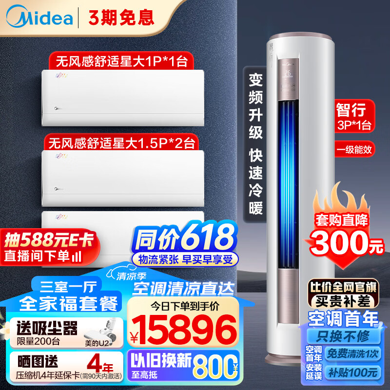 美的(Midea)空调套装 三室一厅(大1匹舒适星一级+1.5匹舒适星一级挂机*2+3匹智行柜机一级)一套购齐价格:15896.00元!
