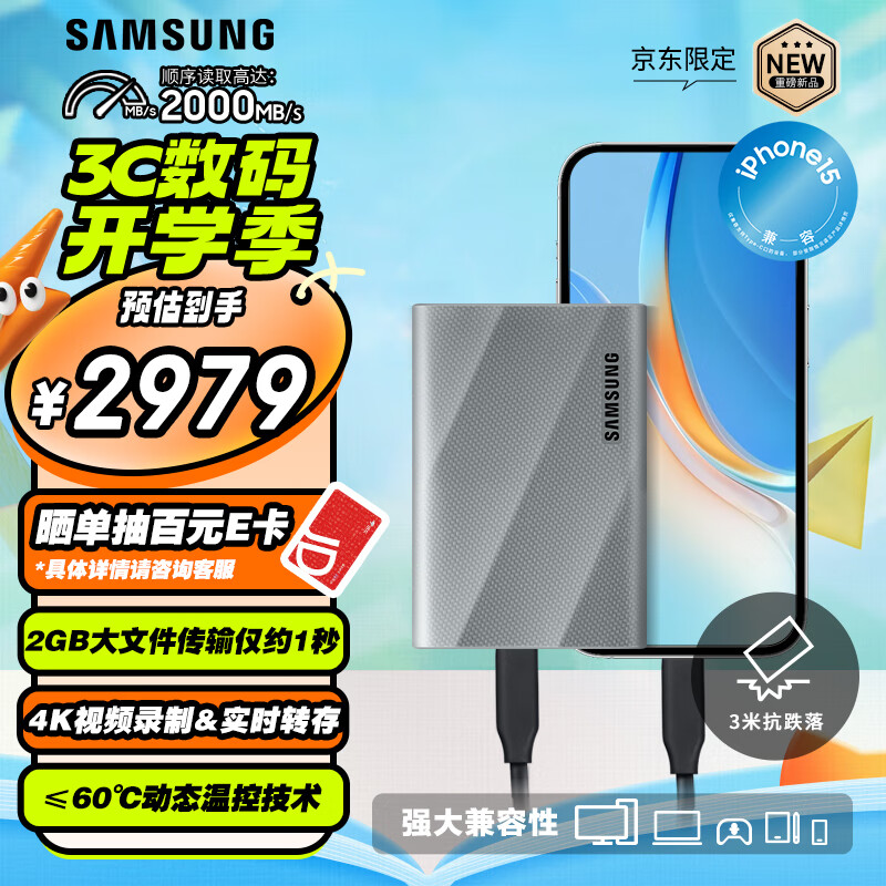 三星(SAMSUNG)4TB Type-c USB 3.2 移动固态硬盘 T9星际灰|京东限定 NVMe读速2000MB/s 手机直连笔记本外接价格:3019.00元!