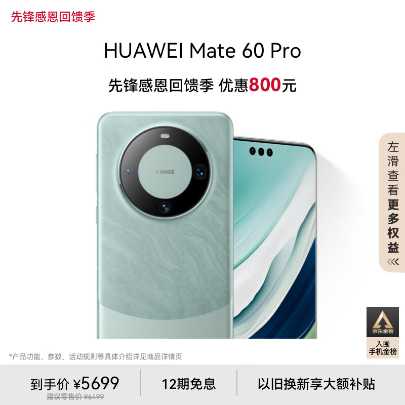 华为(HUAWEI)Mate 60 Pro雅川青12GB+256GB 卫星通话 超可靠玄武架构 全焦段超清影像 旗舰鸿蒙智能手机价格:5699.00元!