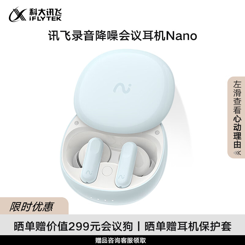 科大讯飞(iFLYTEK)录音降噪会议耳机Nano海盐蓝 无线蓝牙耳机 主动降噪 同传听译 录音转文字翻译苹果华为通用价格:1199.00元!