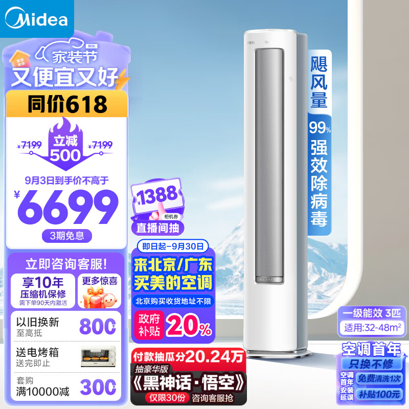 美的空调 3匹 静优风 空调柜机 新一级能效 空调立式 变频冷暖 客厅空调 大风量除菌 KFR-72LW/N8HY1-1价格:6699.00元!
