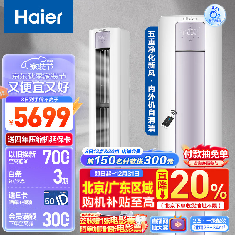 海尔(Haier)新一级能效 2匹 雷神者II 变频冷暖 客厅空调立式柜机 新风空调 KFR-50LW/12LBC81U1 以旧换新价格:5699.00元!