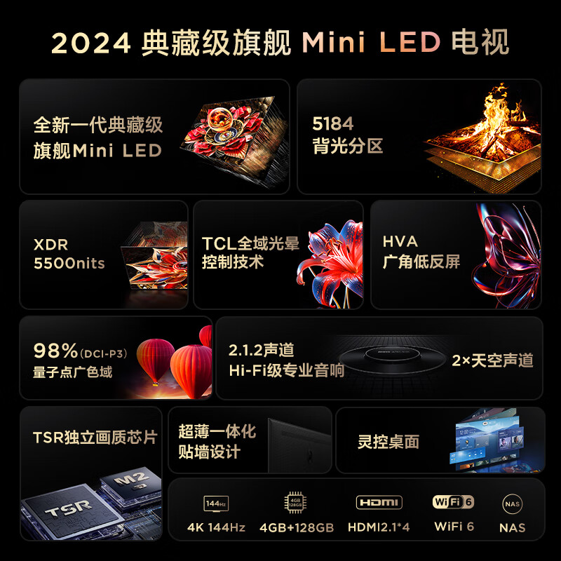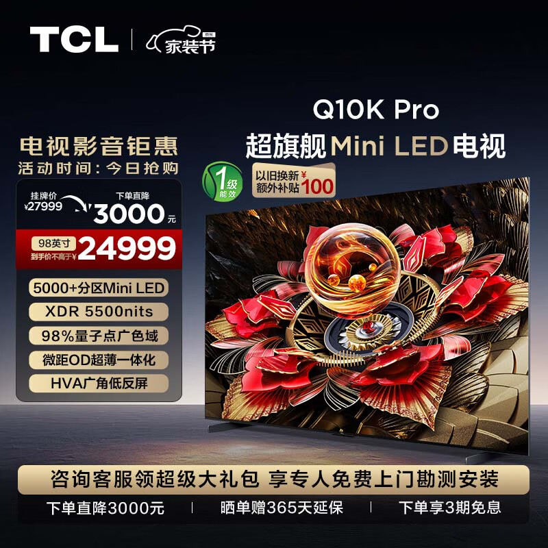 TCL电视 98Q10K Pro 98英寸 Mini LED 5184分区 XDR 5500nits QLED量子点 超薄 北京以旧换新一级能效价格:24499.00元!