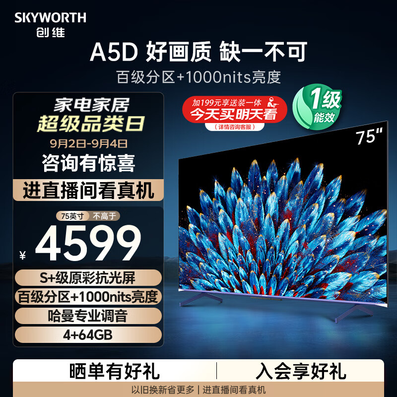 创维电视75A5D 75英寸电视机百级分区 哈曼调音 4K超薄平板巨幕大屏电视 家电北京以旧换新一级能效价格:4599.00元!