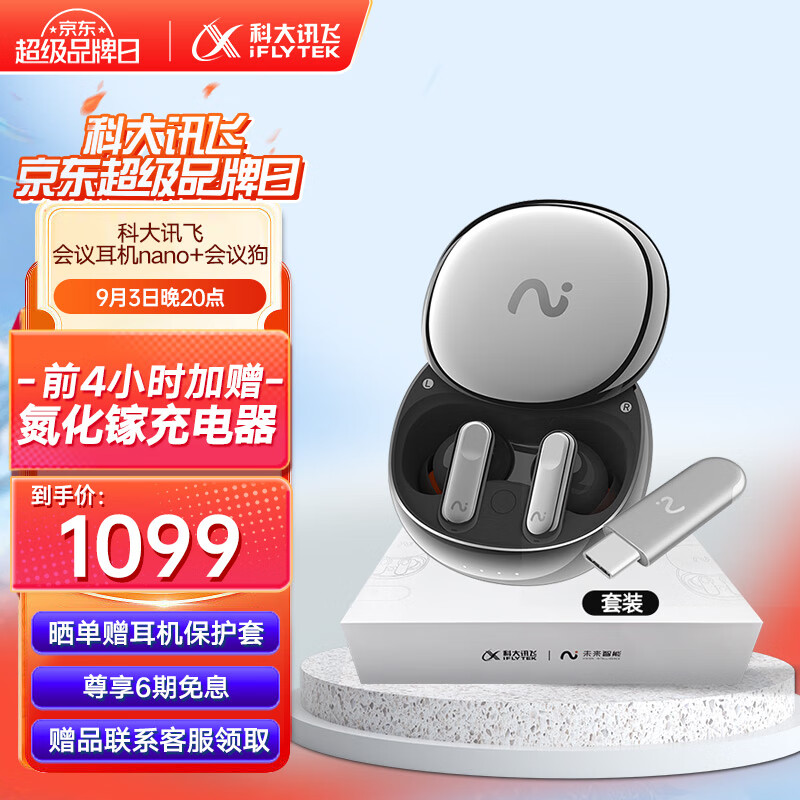 科大讯飞录音降噪会议耳机Nano+ 无线蓝牙耳机会议狗套装 主动降噪 同传听译 录音转文字 苹果华为通用价格:1099.00元!