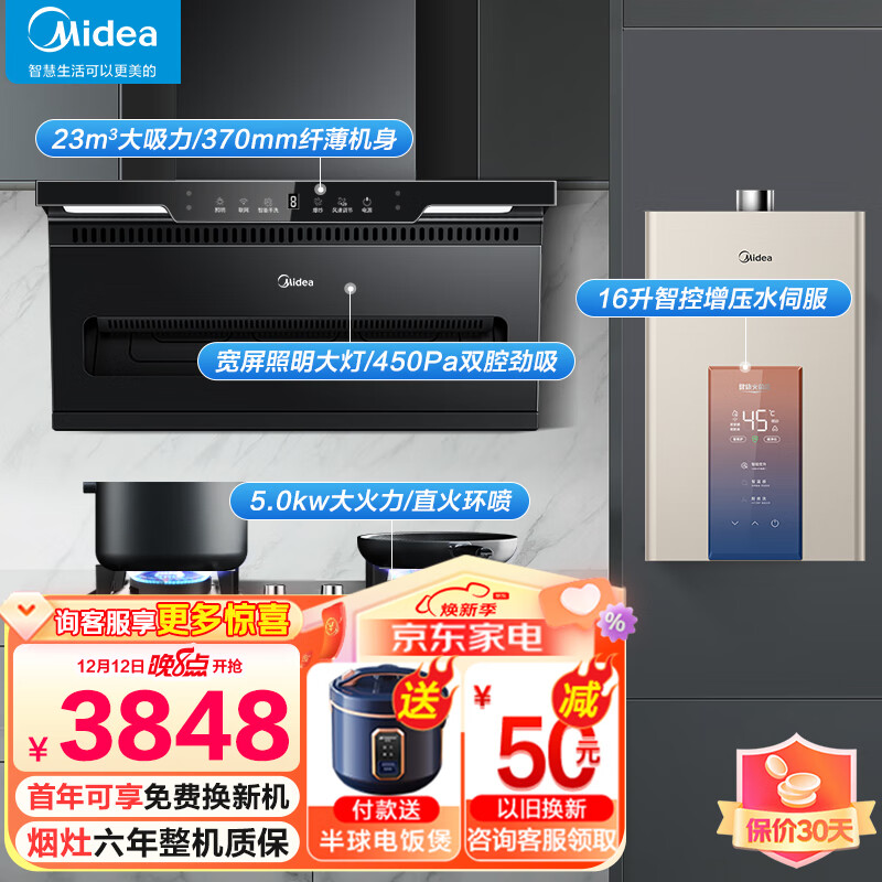 美的(Midea)家用抽油烟机顶侧双吸23立方大吸力油烟机燃气灶具热水器厨房电器三件烟灶套装天然气DC2+330+MK3价格:3848.00元!