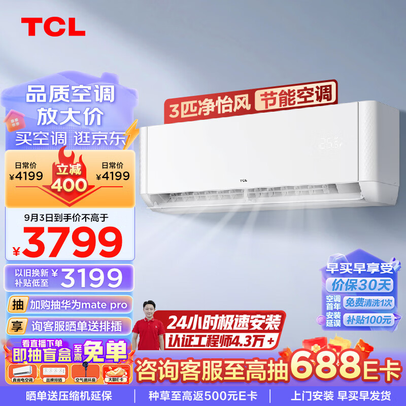 TCL空调 3匹 新三级能效 变频冷暖 净怡风 大风量 卧室壁挂式空调挂机KFR-72GW/JQ2Ea+B3以旧换新价格:3799.00元!