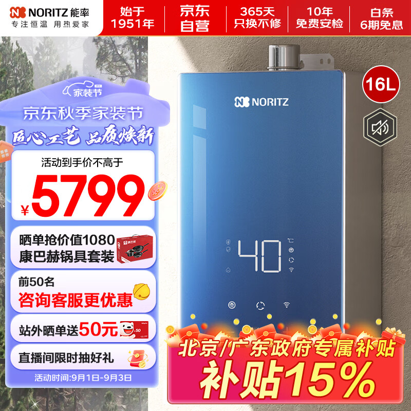 能率(NORITZ)零冷水燃气热水器16升 双智控 幻彩系列屏 水量伺服器 GQ-16EX6AFEXQ(JSQ31-EX6AQ)天然气价格:5799.00元!